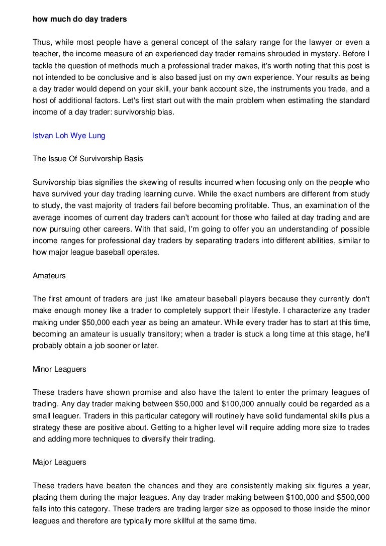 Day traded for 7 months, and failed. 5 days ago · save job · The question of how much money day traders make is difficult to answer not only because the answer will vary from trader to trader, but also because the vast majority of traders don't publicly disclose their incomes in the same way that other professions do.